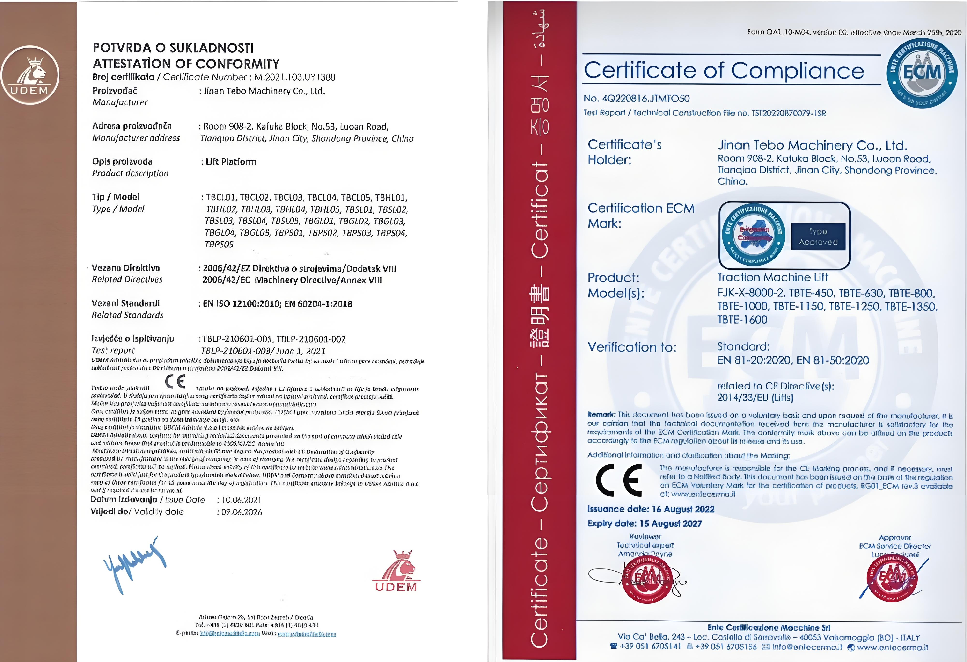Each elevator undergoes multiple inspections during the production process, from initial raw material inspection to final product testing. In addition, the company has a strict quality control system. Each elevator undergoes multiple inspections during the production process, from initial raw material inspection to final product testing. We comply with CE and EU standards, as well as ISO 9001 international quality testing, to ensure high-quality and safe products.
